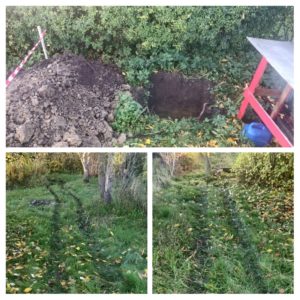 Derfor har de i stedet været inde i have 3, 5, 7 og 11 og grave “små” huller, til der hvor samlebrønden skal placeres.