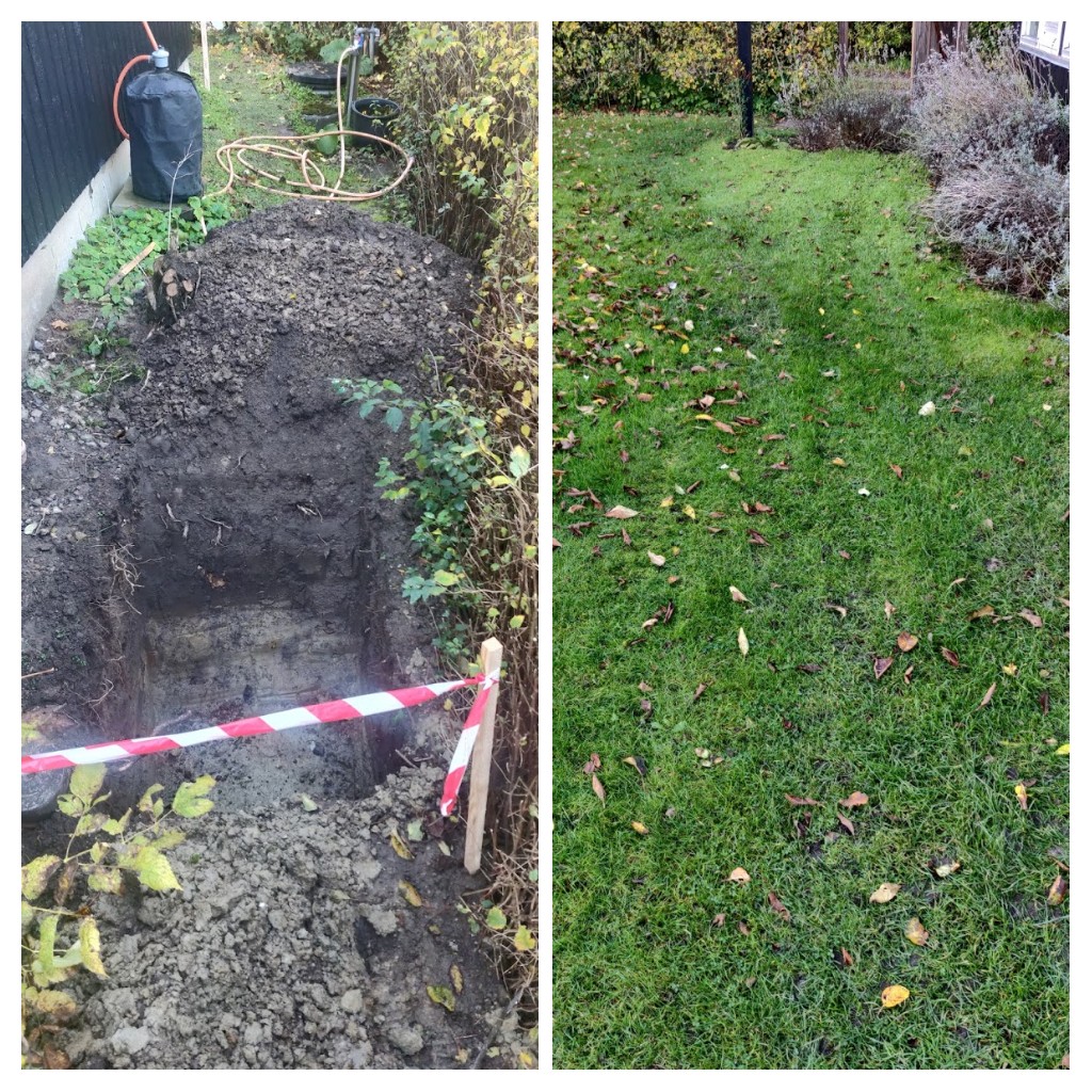 Derfor har de i stedet været inde i have 3, 5, 7 og 11 og grave “små” huller, til der hvor samlebrønden skal placeres.