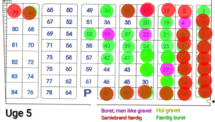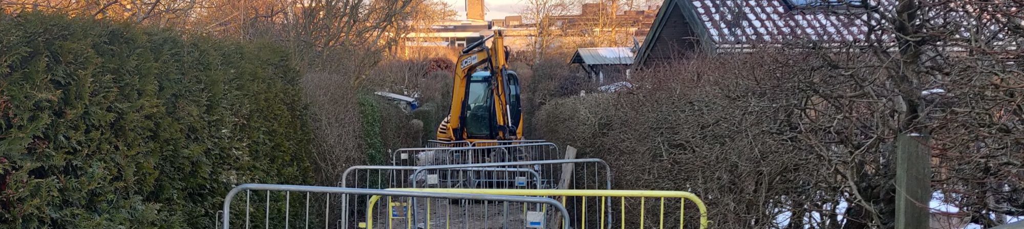 De små gravmaskiner, der bruges inde i haverne til samlebrønde, begynder at blive udfordret. Vi håber på der snart bliver tøvejr – selvom det er skønt, at der ikke længere er mudder🤞