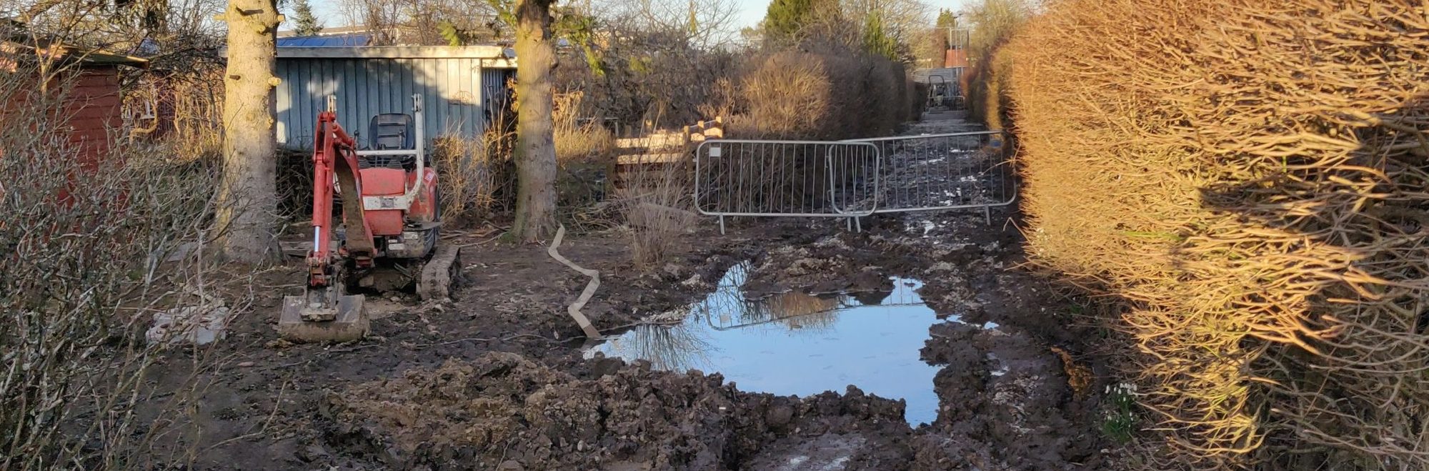 Nederste havegang er så dårlig, at vi bliver nød til at grave dræn ned ude i vejen. Lidt hyggeligt med et gadekær ud foran Fælleshaven? , men tænker ikke de berørte haver er vilde med den idé. Vejen bliver desværre gravet op igen.